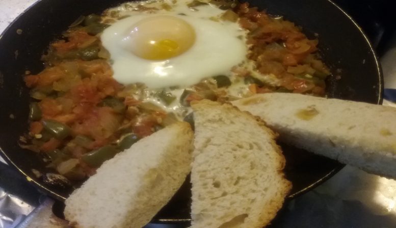 Most students turn to eggs as their quick ‘ food fix’. Eggs are nutritious, easy to cook, cheap and there is so much you can do with them. But eggs can get boring if you cook them the same way all the time. I came across this recipe recently; the vibrant colors topped with the eggs looked so appealing, I knew straight away that I had to try it. I did not have all the ingredients for this recipe but I really wanted to attempt it. I decided to go with the flow; give it my own taste based on the items I had in my kitchen then. The result was a really yummy, easy and complete dish! It probably tastes a little like the original Middle Eastern dish, is filling and has that play on tangy-sweet-spicy! Once you attempt this dish, you will find yourself wondering of all the different flavor combinations that work well with it. It is a dish you can experiment with.Â