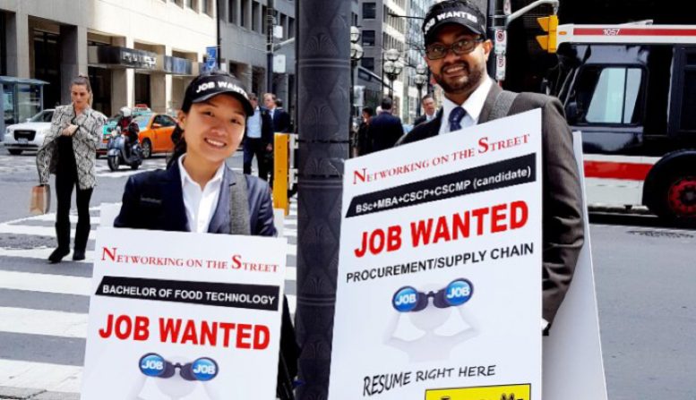 Trang and her husband Rakesh decided to approach their job search differently. After months of disappointment and dead ends they stood at a busy intersection (in Downtown Toronto) and handed out pens–that enclosed strips of paper detailing their education and work experience–wearing sandwich boards! These drastic measures got them noticed.