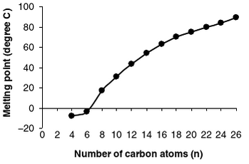 This can be seen in the figure below by Ernesto M. Hernandez, Afaf Kamal-Eldin, and Ernesto M. Hernandez which show the relation between melting point and the number of carbon atoms in saturated fatty acids. [2]