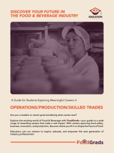 OPERATIONS/PRODUCTION/SKILLED TRADES A Guide for Students Exploring Meaningful Careers in Are you a student or recent grad wondering what comes next? Explore the exciting world of Food & Beverage with FoodGrads—your guide to a wide range of rewarding careers that make a real impact. With careers spanning food safety, business, innovation, and production, discover where you fit in to shape the future of food. Educators, join our mission to inspire, educate, and empower the next generation of industry professionals! DISCOVER YOUR FUTURE IN THE FOOD & BEVERAGE INDUSTRY
